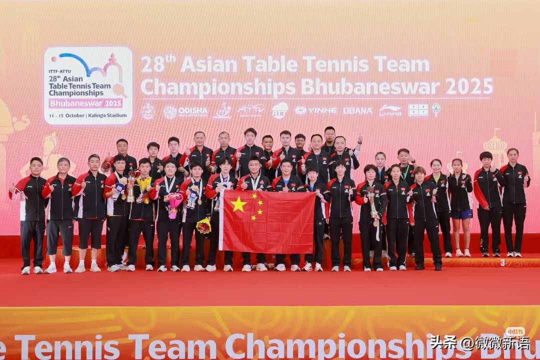 这次在印度,大家肯定也吃不惯那里的东西,看到牛冠凯发的带了泡面、面包、矿泉水等。今年我们男团、女团都夺冠了,离不开背后陪练和后勤保障人员的共同砥砺,看到男队女队一起合影了,王皓和邱贻可站在中间,两边是这次参赛的运动员们,大家团结一心,才取得这么好的成绩。