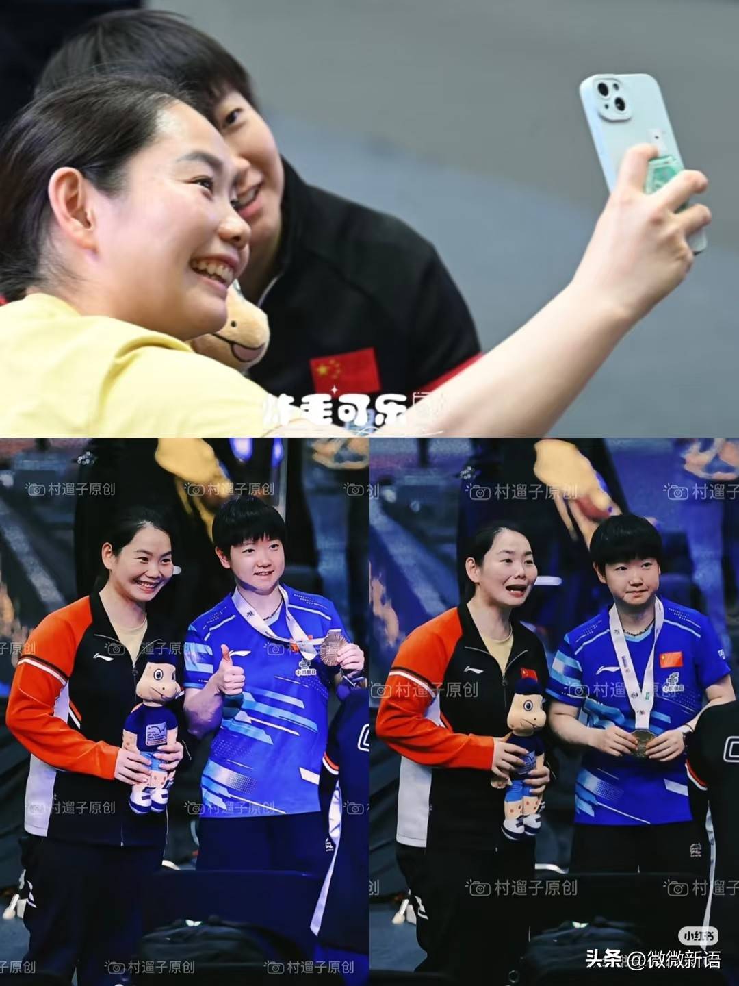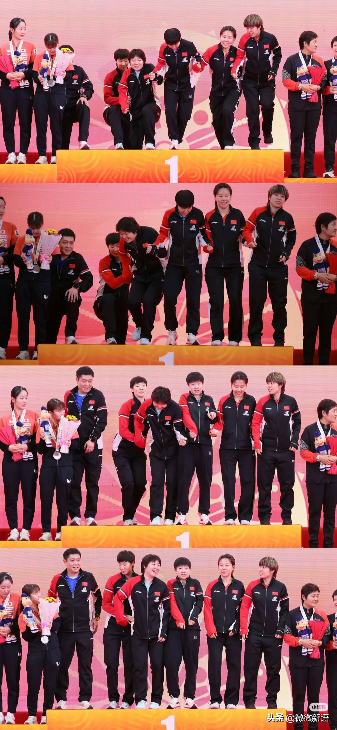 昨晚他们在比赛场馆等了一个多小时,估计大家也在台下聊了一个多小时。这次的领奖台设计的有点小了,感觉有点挤不下,莎莎在台下跟大家说了要手牵手一起跨上领奖台,看蒯曼上不去,莎莎在上面拉着,王曼昱在下面扶蒯曼一把,蒯曼这待遇真好,估计都有点不好意思了,没人管邱导了,快被挤到大藤那里了,哈哈。蒯曼站上去,差点把莎姐挤下去,消息的时候没看到这个画面,今天看到后确实很欢乐。