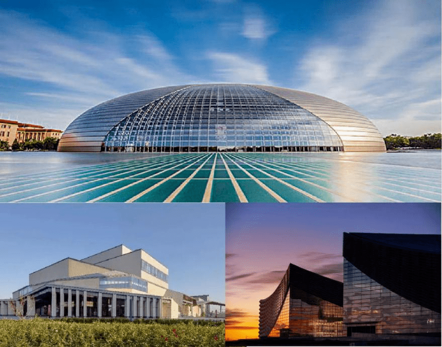 北京艺术中心位于流淌千年的大运河畔,形似古粮仓的独特设计,被誉为“文化粮仓”。总建筑面积12.5万m²,由三座独立的建筑体组成,包括4个室内剧场,分别是歌剧院、音乐厅、戏剧场,小剧场和1个户外露天剧场。歌剧院1760座观众席,音乐厅1500座,戏剧场1000座,小剧场500座,露天剧场固定座席850座,总计观众席5610座。其中歌剧院拥有国内最大、功能最全的沉浸式扩声系统;葡萄园式音乐厅拥有镇厅之宝“法式浪漫派”管风琴;汇聚8K、5G、AR、VR、全景声等,观众可以感受到“艺术+科技”最新应用成果。