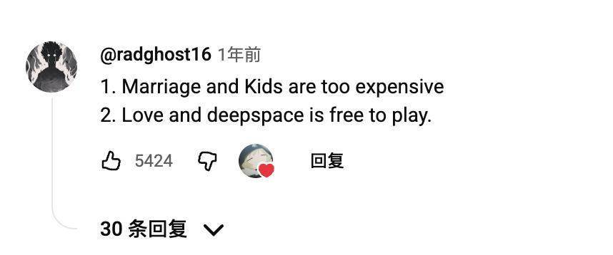 视频下评论区中的热评第一名写道:“1.婚姻和孩子太贵了;2.恋与深空是免费的。”这条评论获得了5424个赞。