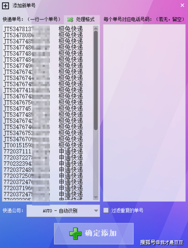 3.在快递批量查询界面中,点击“添加单号”按钮。你可以选择手动输入快递单号,或者从TXT文档中导入单号。如果选择从文档中导入,确保单号按照一行一个的排序方式排列,点击“确定添加”按钮。
