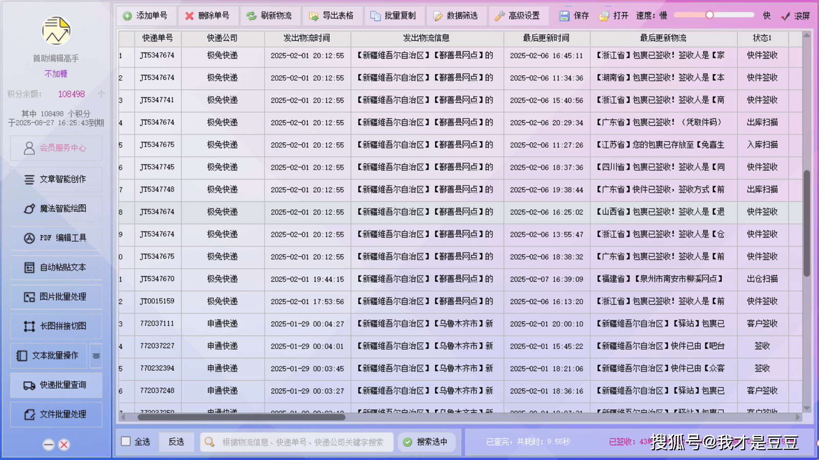 怎么样,是不是被快递批量查询高手软件的强大功能深深震撼了?它不仅解决了快递单号查询和筛选的难题,还让你的办公生活变得更加轻松和高效。现在,你已经掌握了这款办公软件的秘密武器,再也不用担心繁琐的快递处理工作了。无论是批量查询快递物流状态,还是根据签收时间筛选单号信息,快递批量查询高手软件都能轻松搞定。快来试试吧,让你的物流查询任务变得简单又快捷!返回搜狐,查看更多