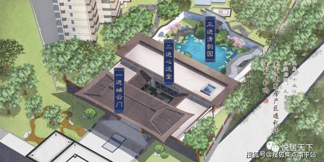 建发·和鸣从苏州园林当中提炼出与项目相契合的元素“山、曲、水”三个元素,来演绎“天人合一”的山水灵魂。营造出 “悠然现山景,烟雨寄江南”的唯美韵味。南宁和鸣的归家之礼遵循网师园营造手法,项目整体采用三进礼序,以三进门庭,营造至高礼遇。三进院分别为:一进岫云门;二进心远堂;三进清韵园。每一进院营造了不同的意境与氛围。