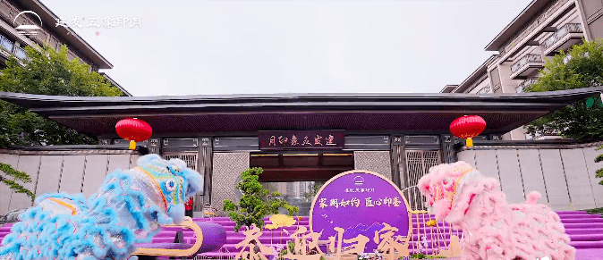 交付当天,现场阵仗很大,大门前铺上独特的紫色地毯,摆设紫色美陈装置,与新中式大门相得益彰。