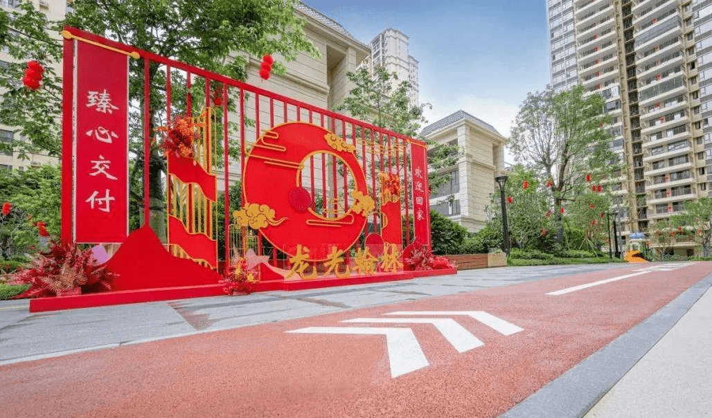 走进荣和·城市之门,可以看到小区内挂满了红灯笼,交付楼栋外红毯铺就,迎接业主的到来。
