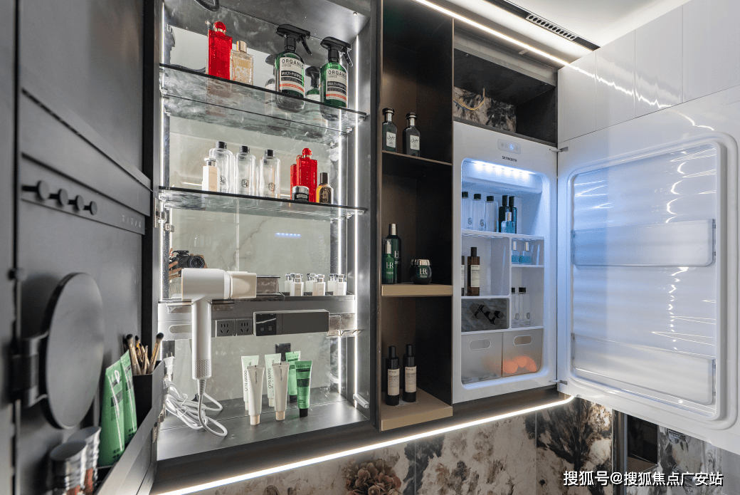 值得一提,保利戳中女性需求,主卫新增科勒美妆龙头,水流角度贴合化妆、护肤需求;主卫镜柜嵌入美妆冰箱,贴心存储口红、面膜等护肤品。