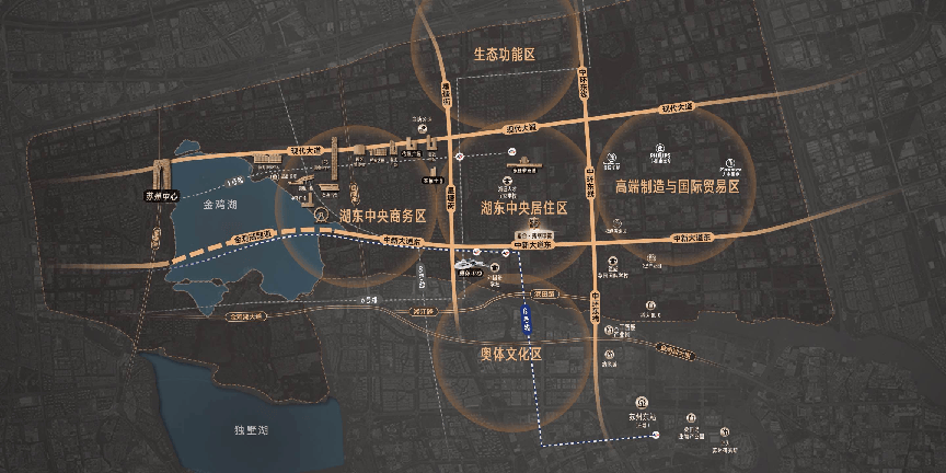 出门就是“两横两纵”主干道(现代大道、中新大道、星塘街、中环东线),去哪都方便。向西,是国金中心、在建的中环广场等繁华商业;向东,是大金、恒瑞医疗等世界级企业总部;南边有举办过无数国际赛事的苏州奥体中心;北面则是白塘公园、东沙湖这样的城市绿肺。